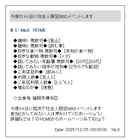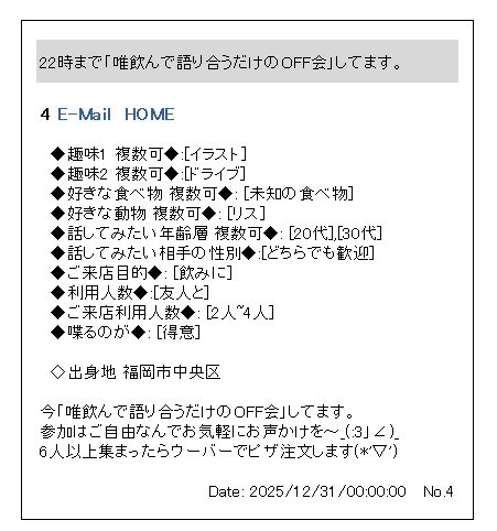 例:酔いすぎな人厳禁っ!ウザ絡みする人厳禁っ! 趣味の合わない人厳禁! 年齢対象外厳禁!など